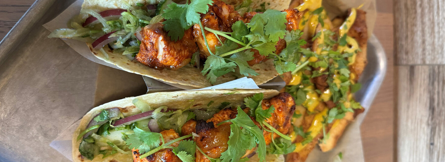 This month’s exclusive is The Tandoori Taco: Soft tortillas filled with grilled marinated tandoori chicken, green chili salad, and topped with mango chutney and fresh cilantro. Served with a side of masala naan chips and mango curry aioli.
